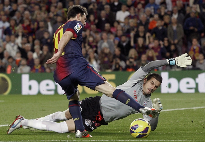 Нападающий «Барселоны» Лионель Месси (справа) в матче 10-го тура чемпионата Испании с «Сарагосой» (3:1) старался, но забить не смог. / Фото: © Reuters -