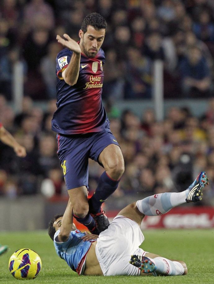 Матч 10-го тура чемпионата Испании «Барселона» - «Сельта» (3:1). Полузащитник «Барселоны» Серхи Бускетс и нападающий «Сельты» Алекс Лопес (снизу) борются за мяч. / Фото: © Reuters -