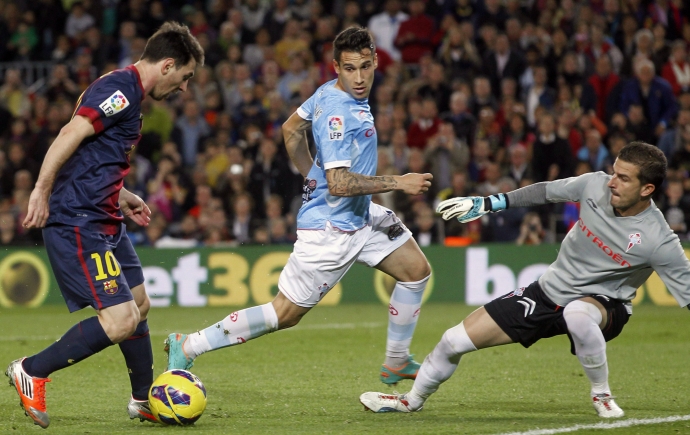 Матч 10-го тура чемпионата Испании «Барселона» - «Сельта» (3:1). Нападающий «Барселоны» Лионель Месси, которому пытаются помешать вратарь «Сельты» Хави Варас и защитник Уго Мальо (в центре). / Фото: © Reuters -