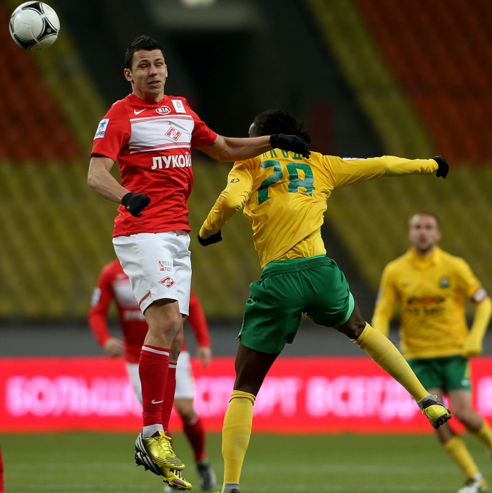Защитник «Спартака» Сальваторе Боккетти (слева) и нападающий «Кубани» Ибрагим Бальде. / Фото: © Getty Images -