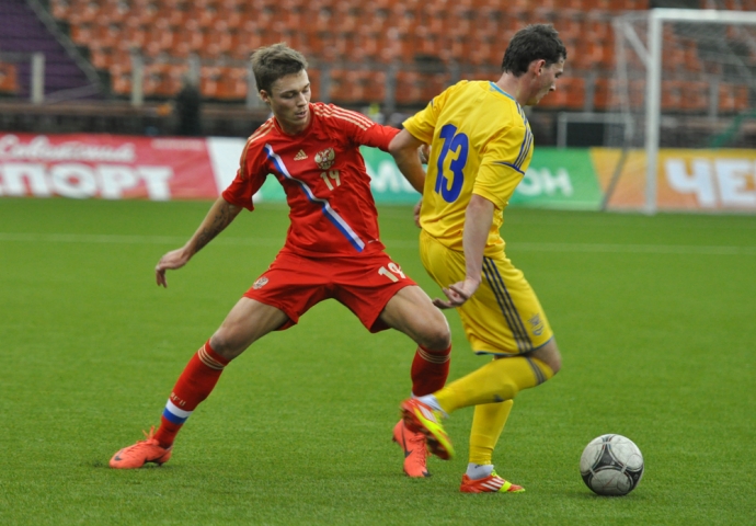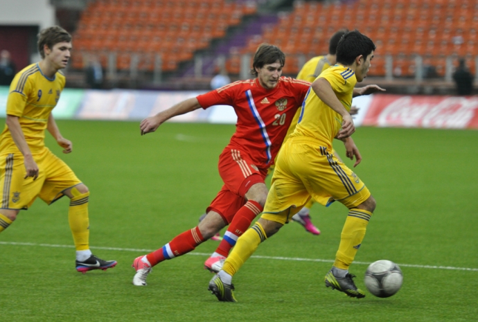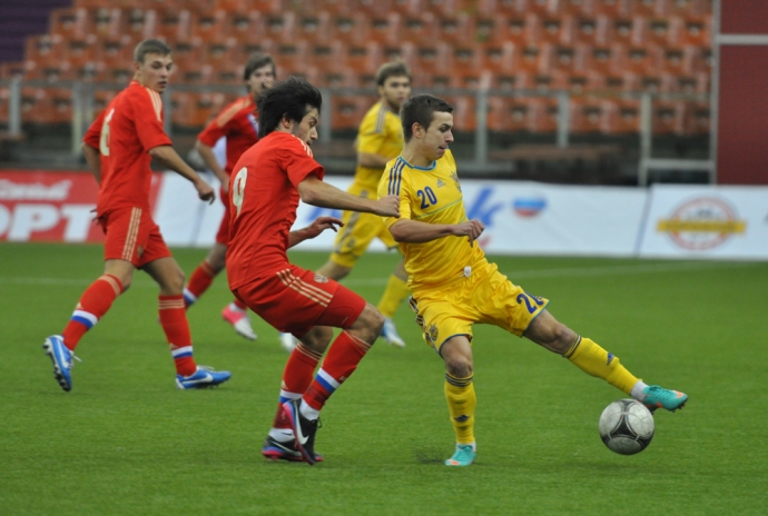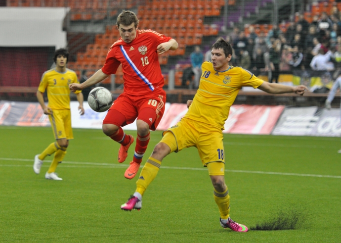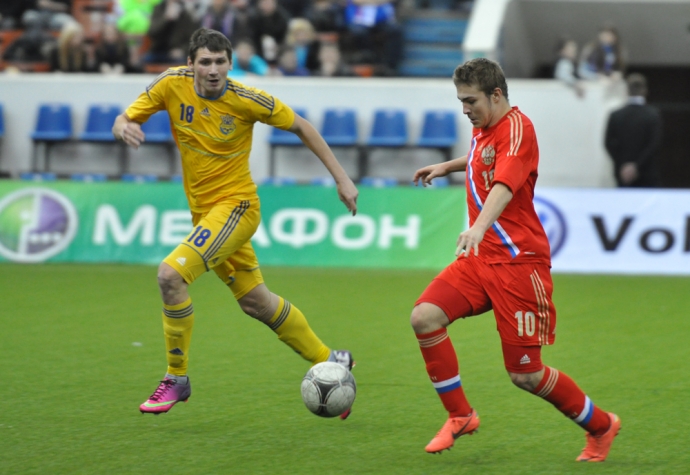 Полузащитник молодёжной сборной Украины Сергей Мякушко и нападающий молодёжной сборной России Магомед Митришев (слева) в финале Кубка Содружества. / Фото: © Елена Разина -