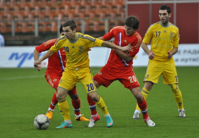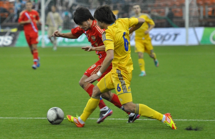 Защитник молодёжной сборной России Дмитрий Голубев пытается отобрать мяч у полузащитника молодёжной сборной Украины Сергея Мякушко (слева) в финале Кубка Содружества. / Фото: © Елена Разина -
