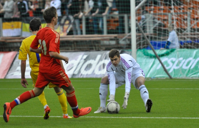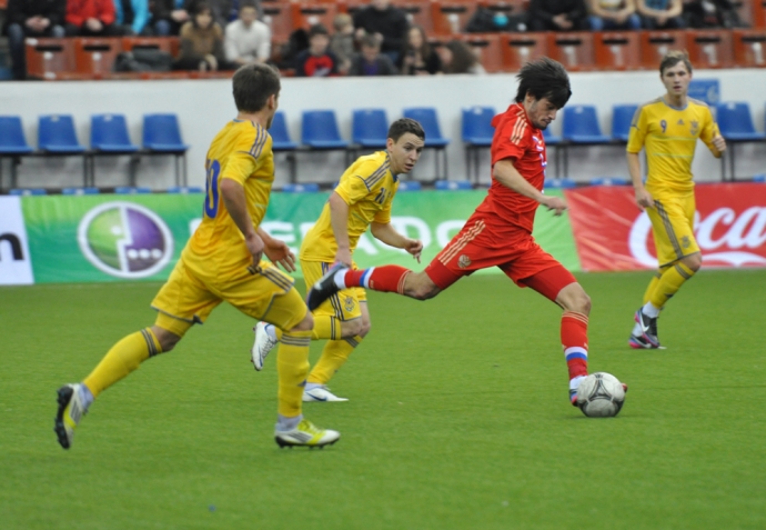 Нападающий молодёжной сборной России Магомед Митришев атакует ворота команды Украины в финале Кубка Содружества. / Фото: © Елена Разина -