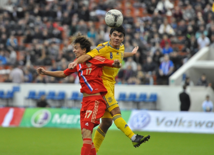 Полузащитник молодёжной сборной Украины Александр Нойок (справа) выигрывает воздушную дуэль у полузащитника молодежной сборной России Дмитрия Каюмова в финале Кубка Содружества. / Фото: © Елена Разина -