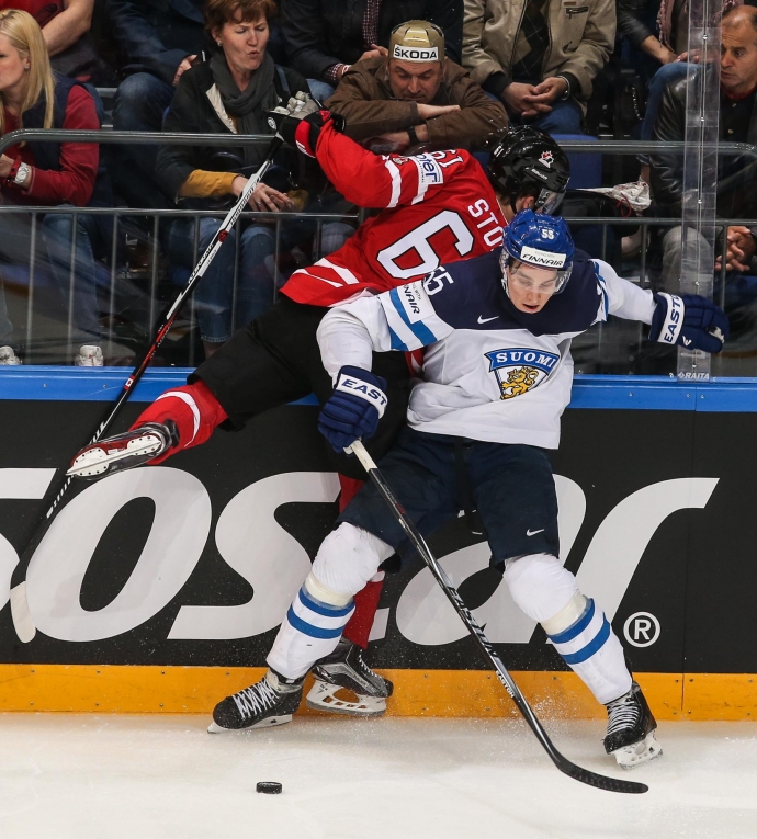 Защитник сборной Финляндии Атте Охтамаа (№55) применяет силовой прием против нападающего сборной Канады Марка Стоуна / Фото: Василий Пономарев -