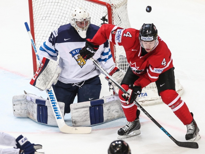 Защитник сборной Канады Морган Райли (слева) в борьбе за шайбу с нападающим сборной Финляндии Патриком Лайне / Фото: Василий Пономарев -